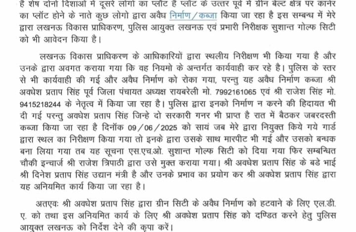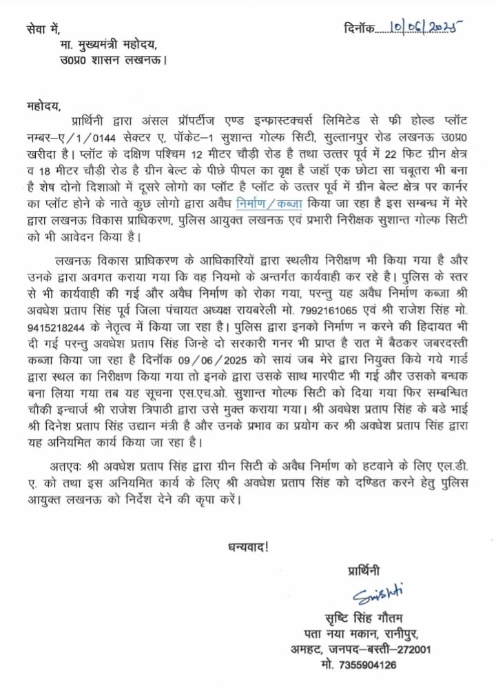 पीड़िता डाक्टर सृष्टि सिंह गौतम ने भी अंसल प्रापर्टीज एण्ड इन्फ्रास्टक्चर्स लिमिटेड से फ्री होल्ड प्लॉट नम्बर- ए /1 / क्यू 144, सेक्टर-ए, पॉकेट-1 सुशान्त गोल्फ सिटी सुल्तानपुर रोड़ लखनऊ में खरीदा है,उक्त प्लॉट अमर शहीद पथ व सुल्तानपुर रोड से कुछ दूरी पर स्थित है। पीड़िता के प्लाट के दक्षिण पश्चिम में 12 मी० चौड़ी रोड़ है व उत्तर पूर्व में 18 मी० चौड़ी रोड़ व ग्रीन क्षेत्र पर पूर्व जिला पंचायत अध्यक्ष रायबरेली अवधेश प्रताप सिंह व राजेश सिंह द्वारा कब्जा किया जा रहा है। पीड़ित डाक्टर सृष्टि सिंह गौतम ने मुख्यमंत्री को भेजे गए पत्र में आरोप लगाया है कि इन लोगों को पुलिस ने हिदायत भी दी थी लेकिन अवधेश प्रताप सिंह जो सरकारी गनर प्राप्त हैं रात में बैठकर जबरजस्ती कब्जा करवा रहा है साथ ही उसके द्वारा पीड़िता द्वारा वहाँ नियुक्त सुरक्षा गार्ड के साथ मारपीट भी की गई। गार्ड को दबंगों ने बंधक भी बना लिया।