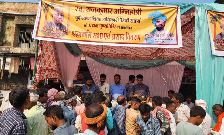 सीतापुर। शिक्षा जगत में जनपद में लंबे समय तक सेवा करने वाले पूर्व एबीएसए राजकुमार अग्निहोत्री उर्फ डिप्टी साहब की प्रथम पुण्यतिथि श्रद्धा पूर्वक मनाई गई । इस अवसर पर सीतापुर जनपद के जानी-मानी हस्तियों ने उन्हें श्रद्धा सुमन अर्पित किए । इस अवसर पर उनके सुपुत्र भारत तिब्बत सहयोग मंच के जिला अध्यक्ष एडवोकेट प्रभात अग्निहोत्री द्वारा श्रद्धांजलि सभा का आयोजन नगर के पडाव मार्केट पर किया गया। यहीं पर विशाल प्रसाद वितरण कार्यक्रम भी किया गया जहां पर दूर-दूर से आए लोगों ने प्रसाद ग्रहण किया।