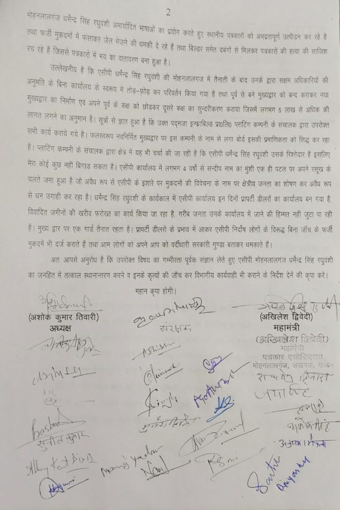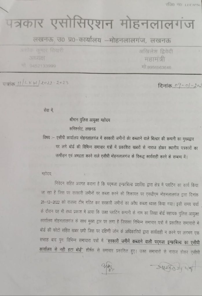 हम बात कर रहे हैं एसीपी मोहनलालगंज की जिनके कारनामे इस समय सुर्खियों में हैं। एसीपी साहब प्रापर्टी डीलरों के साथ बैठकर अब प्रापर्टी डीलरों को संरक्षण प्रदान करने का काम कर रहे हैं। किसी की जमीन की खरीद फरोख्त का काम हो तो एसीपी मोहनलालगंज से मिलिए यह हम नहीं कह रहे हैं बल्कि यह वह पत्र बोल रहा है जो मोहनलालगंज पत्रकार एशोसिएशन के अध्यक्ष अशोक तिवारी ने खुद पुलिस कमिश्नर लखनऊ को दिया है।