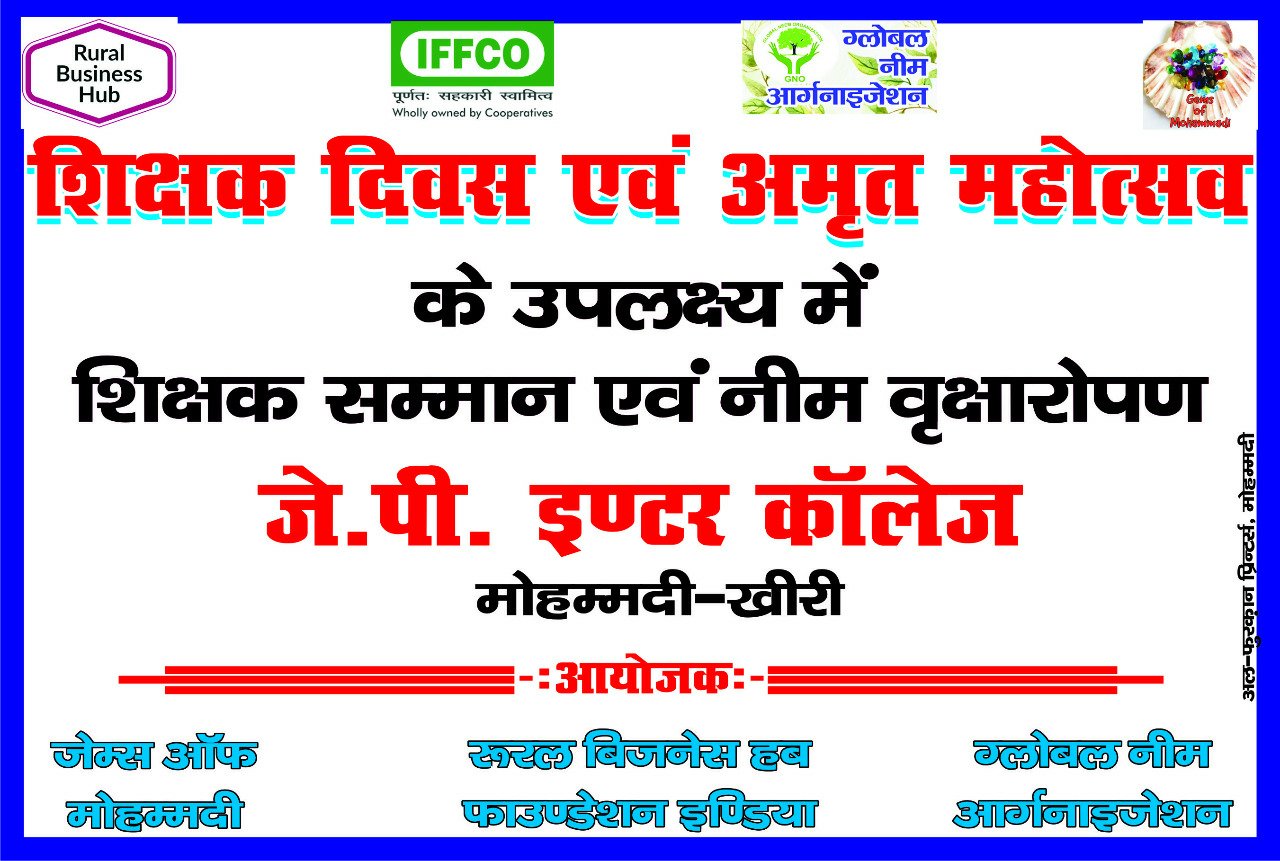 मोहम्मदी: शिक्षक दिवस के अवसर पर नगर के जे पी इंटर कॉलेज में जेम्स ऑफ मोहम्मदी, रूरल बिजनेस ऑफ फाउंडेशन इंडिया और ग्लोबल नीम ऑर्गेनाइजेशन द्वारा शिक्षक सम्मान समारोह और अमृत महोत्सव का आयोजन किया गया। इस कार्यक्रम की शुरुआत करते हुए कॉलेज की कार्यकारिणी सदस्य रामफूल गुप्ता, संचालन कर रहे रमेश प्रताप सिंह, शशि शेखर मिश्रा, रमाकांत मिश्रा, कैलाश नाथ वाजपेई, आर ड़ी राठौर, पीएल विशारद, प्रधानाचार्य मनोज कुमार खरे, डॉ हरिनाथ उपाध्याय, रसायन विज्ञान प्रवक्ता आशीष मिश्रा, भौतिक विज्ञान प्रवक्ता वैभव अवस्थी, ज्ञानेंद्र प्रताप सिंह, सुशील कुमार मिश्रा, रमन कश्यप, विजेंद्र सिंह सहित कालेज के पूर्व छात्र उत्तर प्रदेश रत्न इं० गौरव गुप्ता, इं० मानव गुप्ता, इं० श्याम जी गुप्ता, इं० शिवम परिजातम, साइबर अपराध विधिवक्ता इं० सुमित श्रीवास्तव, पत्रकार गोपाल तिवारी, शुभम शुक्ला, विशाल मिश्रा, मयंक मिश्रा आदि ने डॉ सर्वपल्ली राधाकृष्णन को पुष्प अर्पित किये।