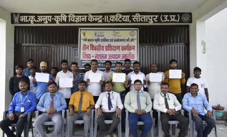 मानपुर/सीतापुर। पिछले कुछ वर्षों में किसानों अथवा युवाओं का रुझान मशरूम की व्यावसायिक खेती की तरफ तेजी से बढ़ा है। मशरूम की खेती बेहतर आमदनी का जरिया बन सकती है। बस कुछ बातों का ध्यान रखना होता है। बाजार में मशरूम का अच्छा दाम मिल जाता है। कृषि विज्ञान केंद्र, कटिया, सीतापुर में 1 से 3 सितम्बर तक चले तीन दिवसीय प्रशिक्षण कार्यक्रम के समापन के अवसर पर केंद्र के प्रभारी अध्यक्ष डॉ दयाशंकर श्रीवास्तव ने बताया कि कृषि में व्यवसायी करण व विविधिता लाने के लिए इस प्रकार के कौशल प्रशिक्षण कार्यक्रमों की महती आवश्यकता है।