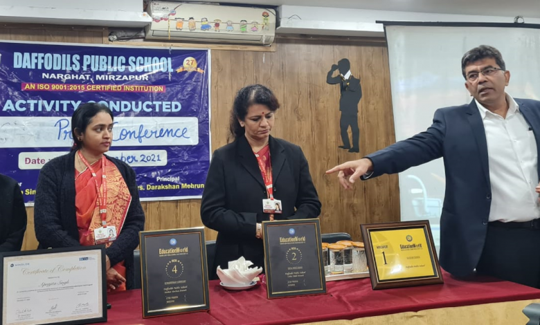 मिर्जापुर 17 दिसंबर 2021 को एजुकेशन वर्ल्ड द्वारा डैफोडिल पब्लिक स्कूल को grand जूरी  इंडिया स्कूल रैंकिंग 2021/2022 के तहत सोशल इंपेक्ट में राष्ट्रीय स्तर पर दूसरा प्रदेश स्तर पर दूसरा और जनपद स्तर पर पहला स्थान प्रदान किया गया है