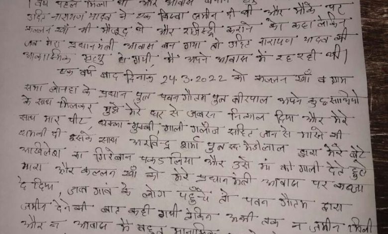 जिससे जमीन की रजिस्ट्री नही हो पाई। पीड़िता अपने आवास में रह रही थी 1 वर्ष बाद बीते 24 मार्च को ग्राम सभा के प्रधान वीरपाल के पुत्र पवन गौतम ने अपने कुछ साथियों के साथ मिलकर मुझे मेरे घर से जबरन निकाल दिया और मेरे साथ मारपीट ,धक्का मुक्की, गाली गलौज सहित जान से मारने की धमकी भी दी। इसके साथ अरविंद शर्मा द्वारा मेरे बेटे अखिलेश का गिरेबान पकड़ कर बुरी तरह मारा गया। कल्लन खान को मेरे प्रधानमंत्री आवास पर कब्जा दे दिया। जब गांव के लोग पहुंचे तो पवन गौतम जो सिंचाई विभाग में कार्यरत है के द्वारा जमीन देने की बात कही गई लेकिन न जमीन मिली न आवास। पीड़िता ने बंथरा पुलिस से आरोपियों के खिलाफ कानूनी कार्रवाई करते हुए उसे उसका आवास दिलाने की मांग की है।