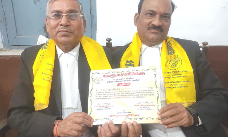 सीतापुर। कानपुर बार एसोसिएशन ,लायर्स एसोसिएशन के द्वारा विभिन्न मांगो को लेकर किए गए आंदोलन व अधिवक्ता प्रादेशिक सम्मेलन में सीतापुर बार एसोसिएशन के अधिवक्ताओं ने बढ़ चढकर हिस्सा लिया था। जिसके क्रम में कानपुर बार एसोसिएशन कानपुर द्धारा जनपद सीतापुर बार अध्यक्ष चन्द्रभाल गुप्ता व महासचिव बुद्धि प्रकाश मिश्रा सहित सैकड़ो अधिवक्ताओ को सीतापुर बार एसोसिएशन के नाम से प्रशस्ति पत्र व अंग वस्त्र देकर प० पृथ्वीनाथ चक अधिवक्ता रत्न से सम्मानित किया। इस दौरान कानपुर बार एसोसिएशन अध्यक्ष नरेश चंद्र त्रिपाठी व लायर्स एसोसिएशन अध्यक्ष रविंद्र शर्मा ने सभी का आभार जताया।