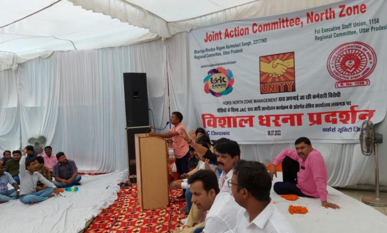 खाद्य निगम के क्षेत्रीय कार्यालय पर भारतीय खाद्य निगम कर्मचारी संघ एवं एफसीआई ईएसयू का हुआ विशाल धरना प्रदर्शन