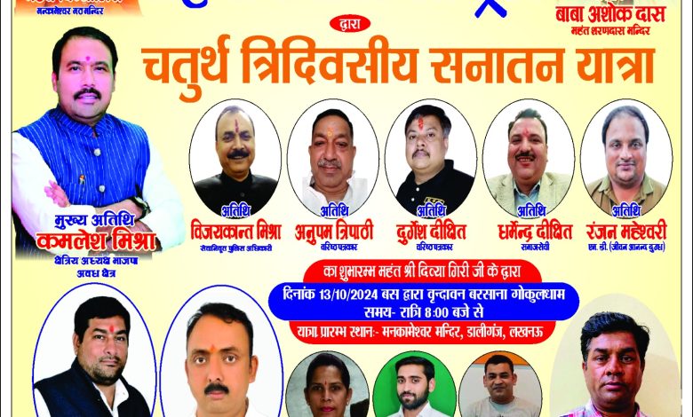 लखनऊ, 12 अक्टूबर। सहयोग चैरिटेबल ट्रस्ट द्वारा चतुर्थ त्रिदिवसीय सनातन यात्रा का शुभारंभ रविवार को महंत दिव्या गिरि जी के कर कमलों द्वारा मनकामेश्वर मंदिर से होगा। इस आध्यात्मिक यात्रा में 151 श्रद्धालु 2 बसों से वृन्दावन, बरसाना, और गोकुल धाम जैसे पवित्र धार्मिक स्थलों के दर्शन के लिए प्रस्थान करेंगे। यात्रा रात्रि 8 बजे मनकामेश्वर मंदिर डालीगंज से शुरू होगी। इसमें श्रद्धालु भगवान श्रीकृष्ण के धामों में जाकर धार्मिक और आध्यात्मिक अनुभवों का लाभ उठाएंगे।