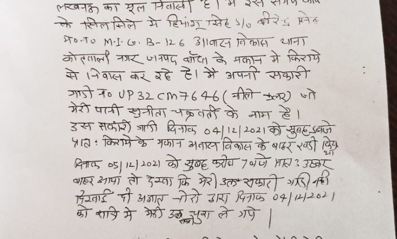 पीड़ित ने प्रभारी निरीक्षक नगर कोतवाली को प्रार्थना पत्र देते हुए अवगत कराया है कि 04/12/21 की रात लगभग 3 बजे चोरों ने सफारी गाड़ी नंबर UP32CM7646 को घर के दरवाजे से चोरी कर ली है जो उनकी पत्नी के नाम रजिस्टर्ड है। चोरी की पूरी घटना वहां लगे सी सी टी वी कैमरे में कैद हो गई है। गौरतलब है कि नगर कोतवाली क्षेत्र में ऐसी वारदातों की बार बार पुनरावृति हो रही है। पीड़ित ने प्रथम सूचना रिपोर्ट दर्ज करते हुए आवश्यक कार्यवाही की मांग की है।